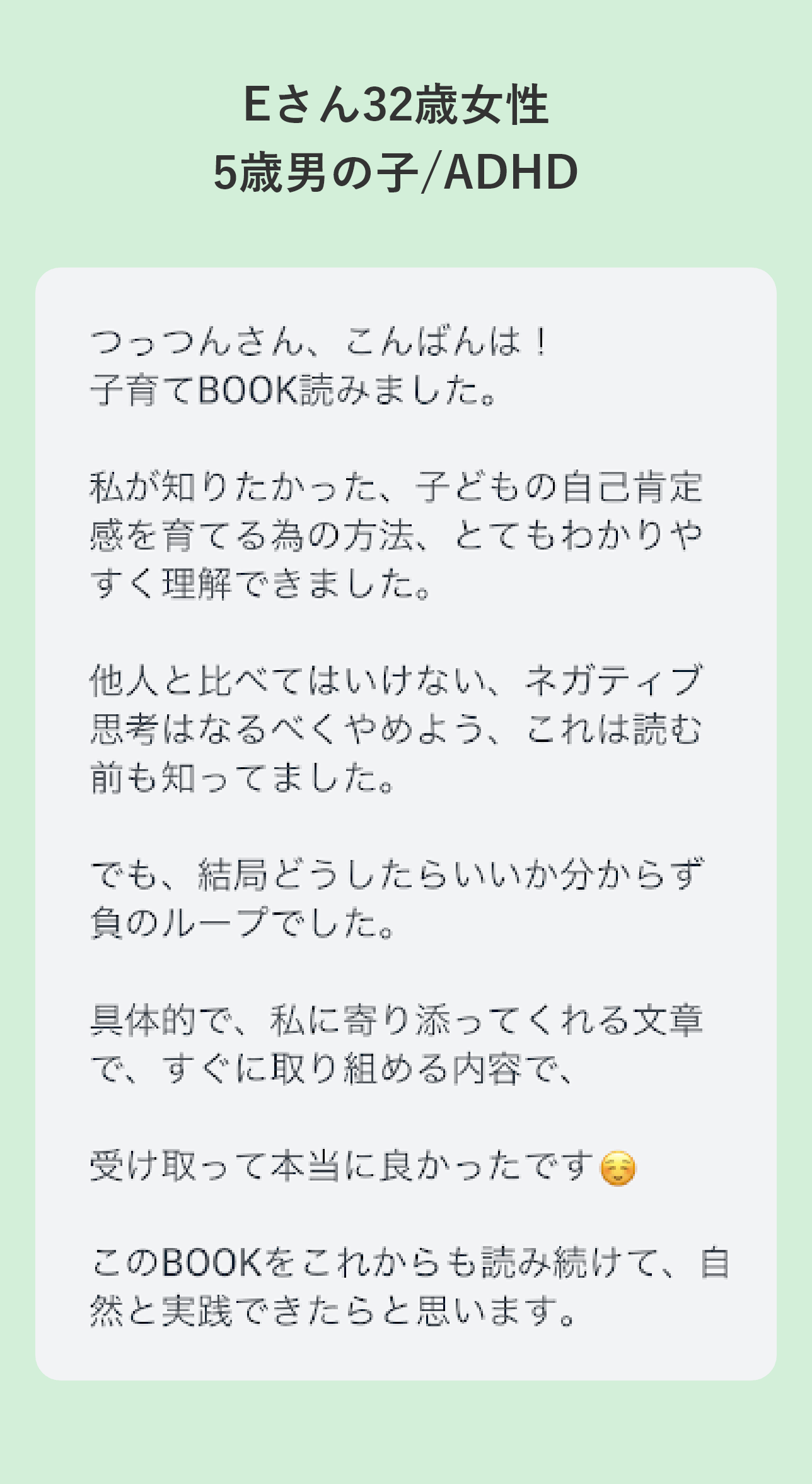 現在は、「発達障がいのある子どもを育てるお母さん」に特化したオンライン講座を中心に、日々の発信や相談サポートを行っており、これまでに、対面やオンラインで1000名以上のお母さんたちの子育てに関わってきた。